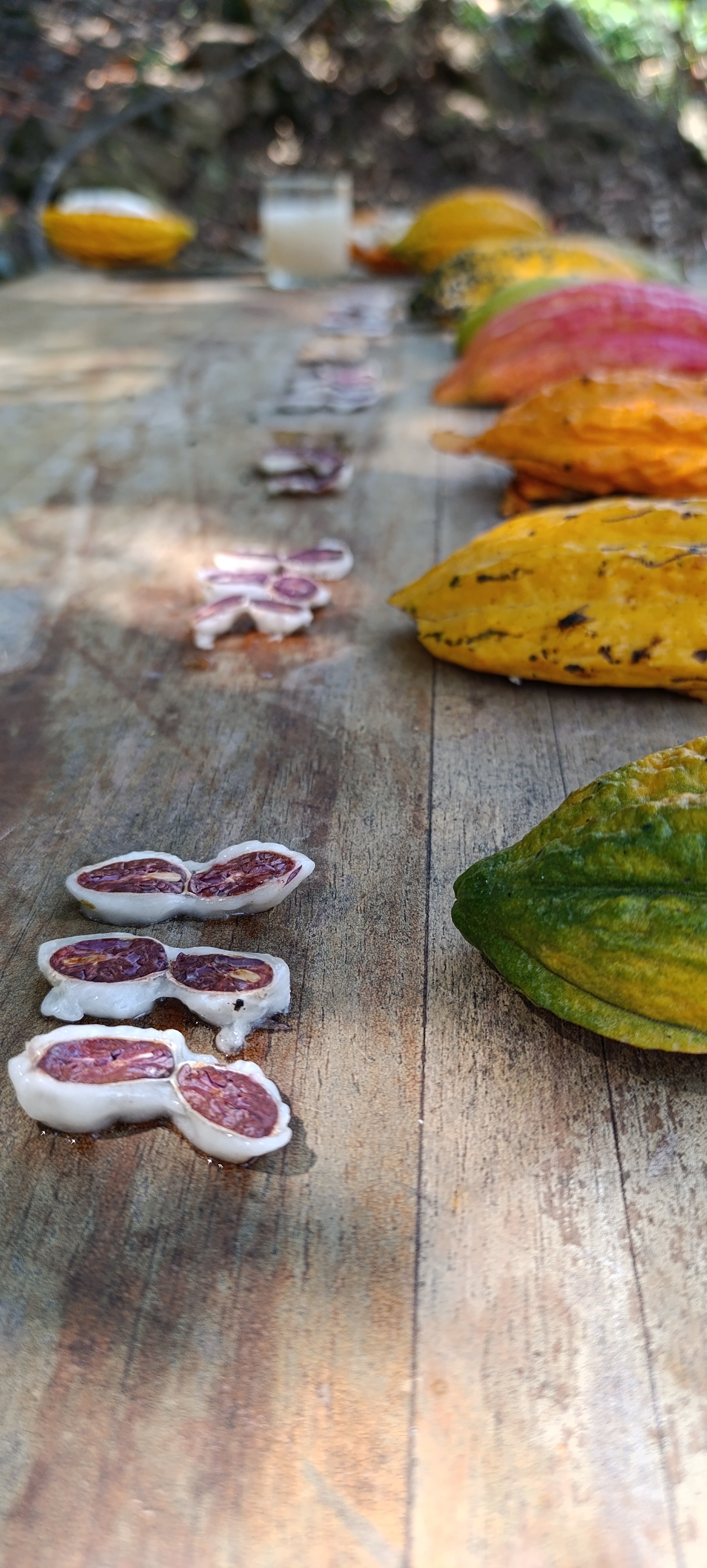 „Peel – Feel – Heal“: Wie in anderen Ländern treffen wir uns und schälen Kakao! Es ist ein Wunder, wenn die einzeln Samen – so farbenfroh – entkleidet werden. Gespräche der Freude und Ehrlichkeit begleiten diesen Prozess zumeist. Die Medizin des Kakaos beginnt genau dort: wir schaffen etwas gemeinsam und sitzen in der „Küche der lebendigen Zutaten“ beisammen. Kakao bringt uns Gemeinschaft, öffnet die Herzen, kitzelt unsere Themen an die Oberfläche, unsere Begeisterung wie auch unsere Traurigkeit. Im ehrlichen (oder authentischen) Beziehen lassen wir entsprechende Gedanken und Emotionen ziehen…