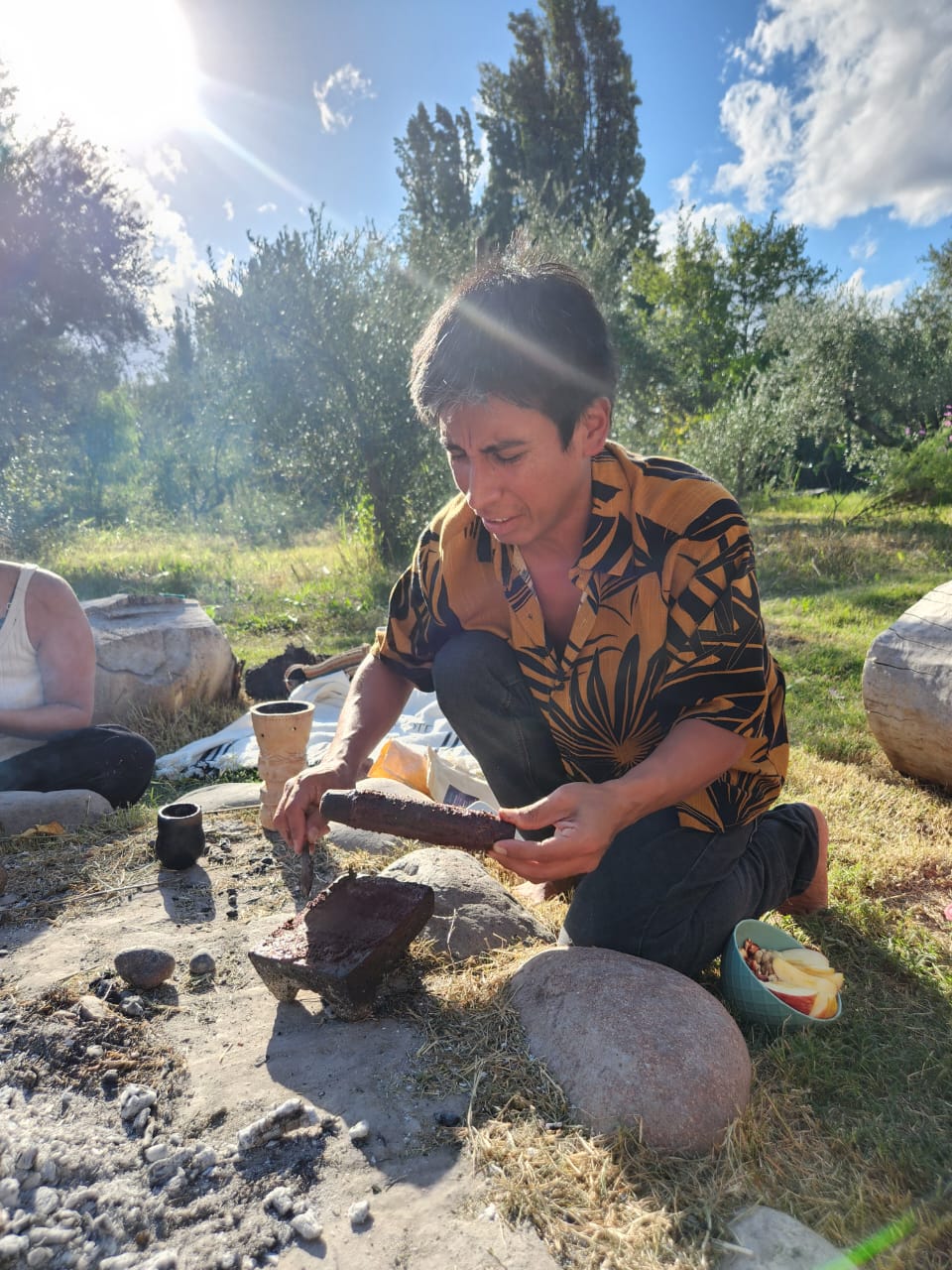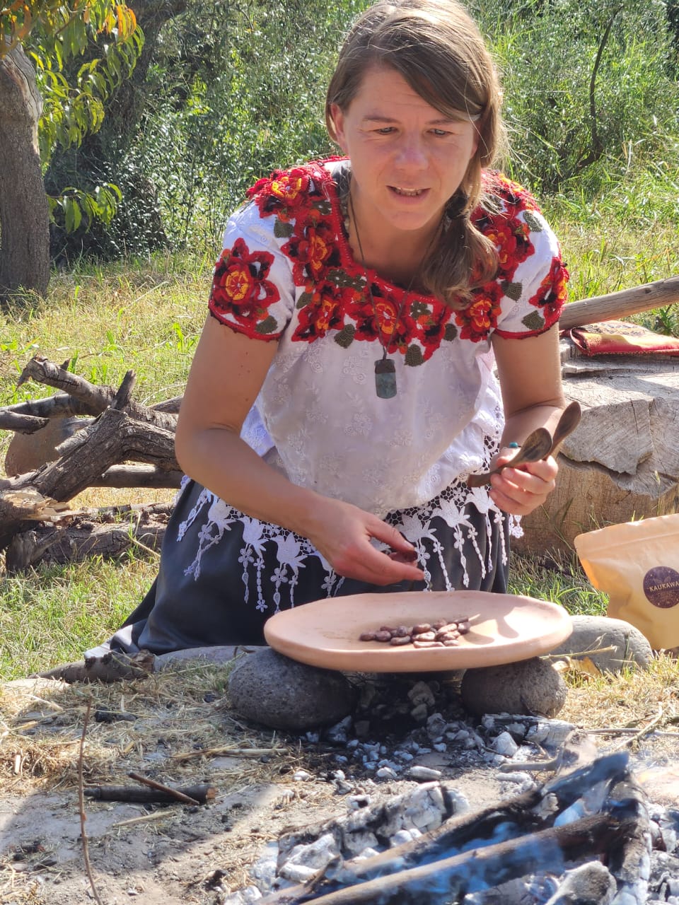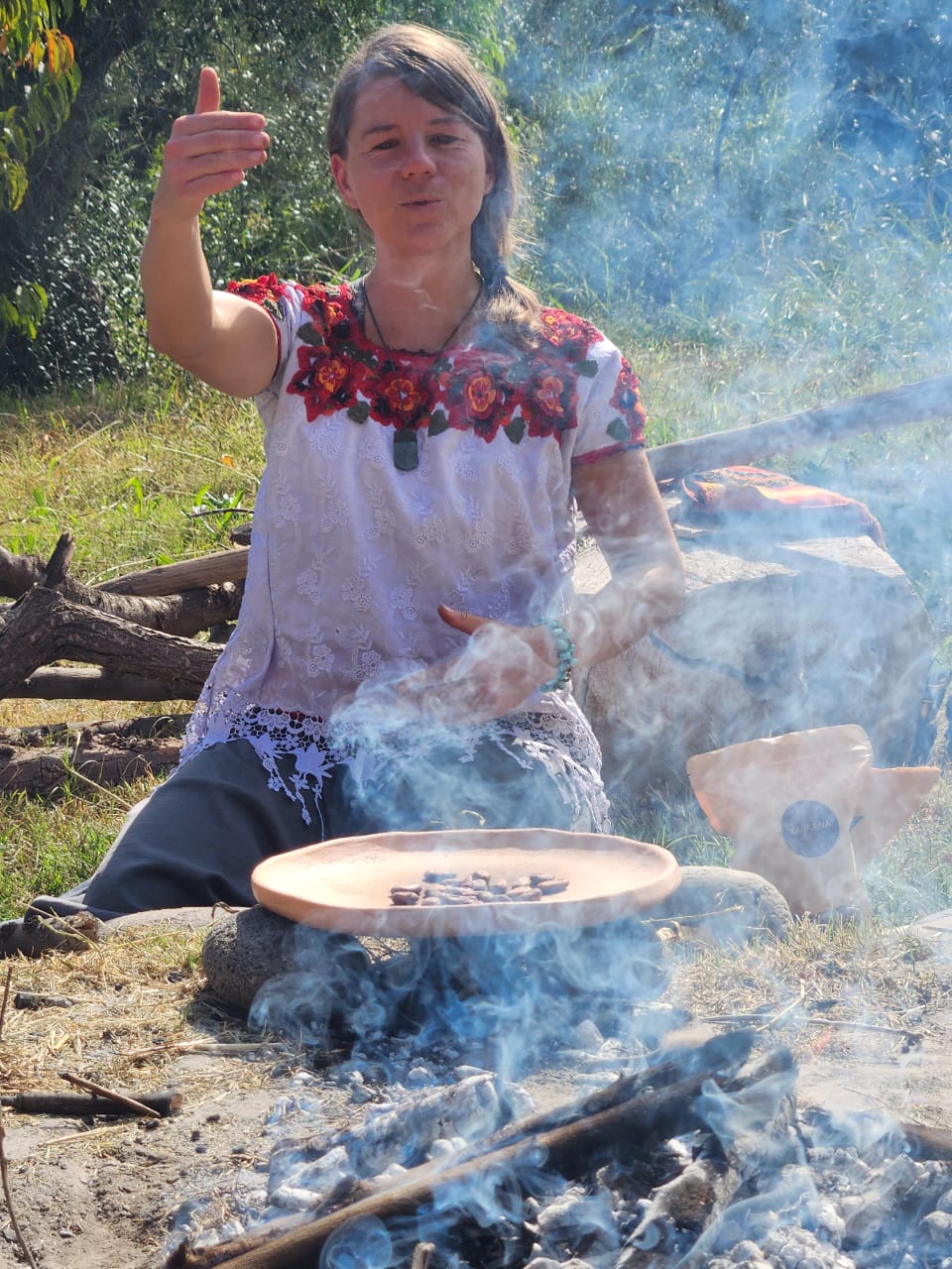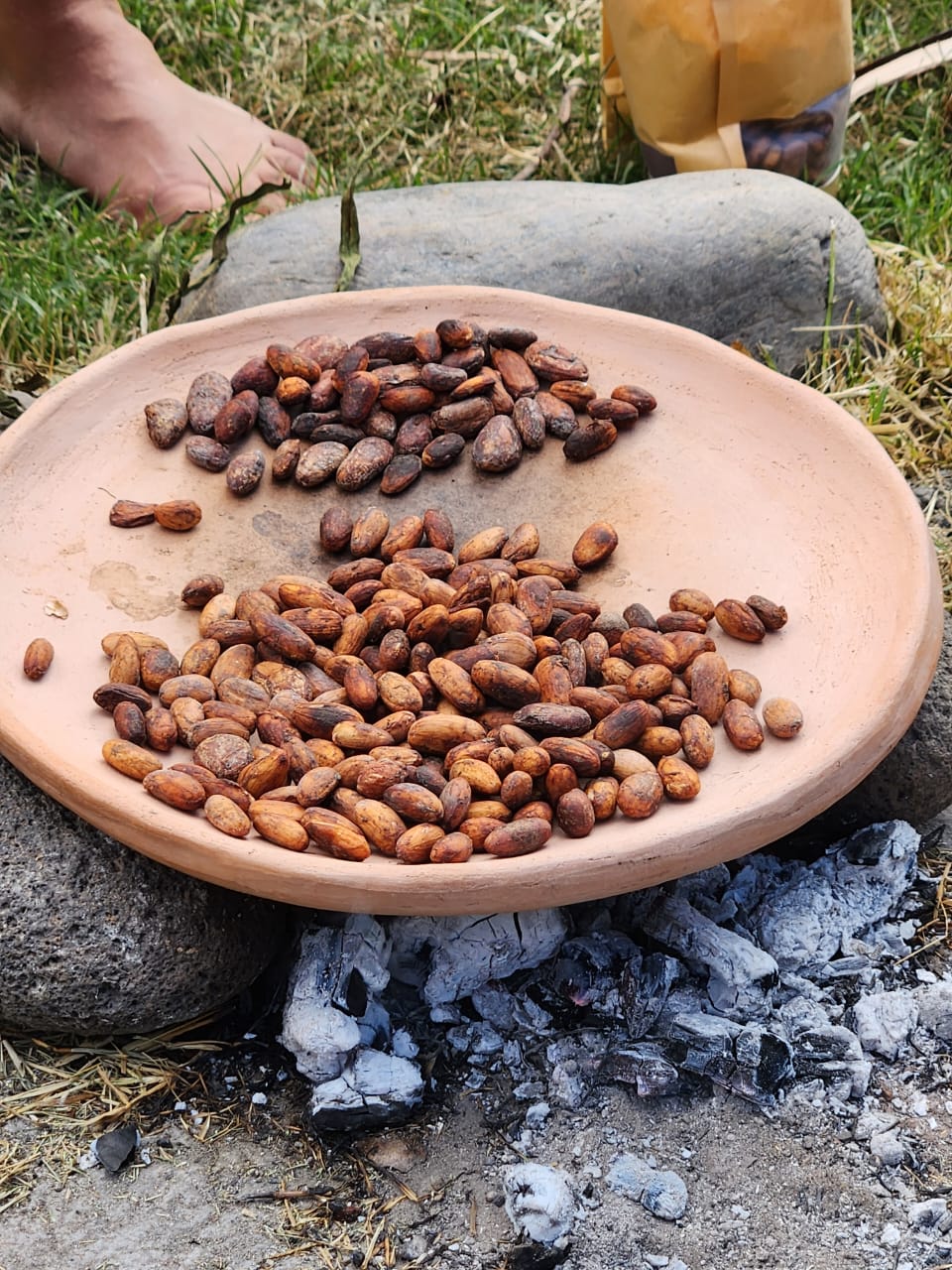 „Der Weg Kakaos – vom ungerösteten Samen zur Tasse“: Wir rösten über dem Feuer oder eine alternativen „Feuerstelle“, lauschen den knackenden und tanzeneden Bohnen. Wir schälen Kakao und verarbeiten die Samen (Bohnen) auf dem Metate. Die Geschichten des Kakaos werden uns dabei begleiten, ihre Stimmen werden uns begleiten. Dann, nachdem alles vorbereitet ist, mit traditionellen Handwerk, wird der Kakao in Wasser alchemisch verührt mit dem sogenannten Molinillo, dem Rührstab, in einem großen Keramik-Topf. Anschließend folgt der magische Moment und wir trinken Kakao. Das Ritual kann dann mit Gesang, Musik und/oder Meditation begleitet werden.