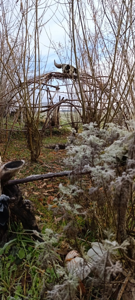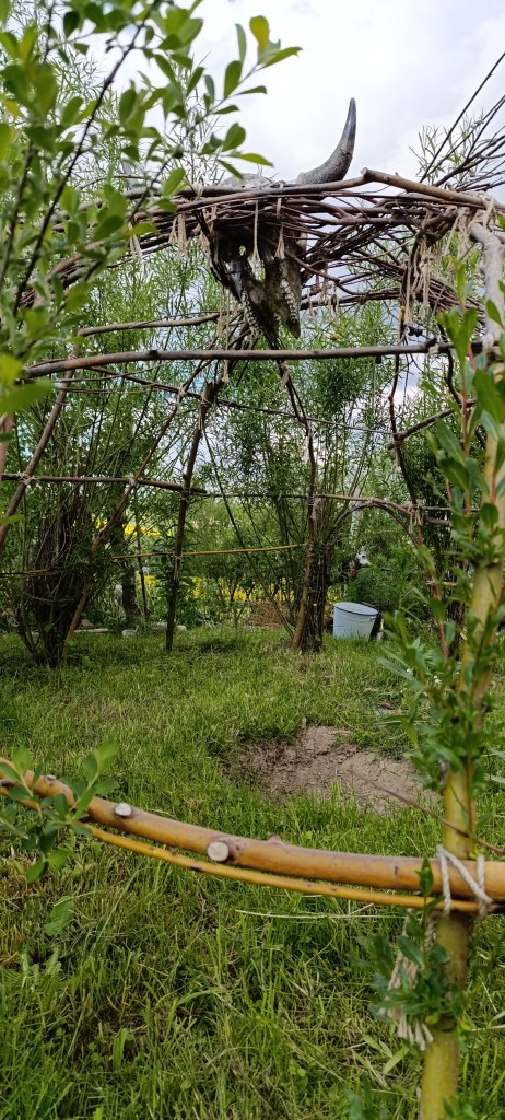 Die Schwitzhütte symbolisiert die große schwangere Mutter, in deren Wasser wir einst genährt und aus der wir eins(t) geboren worden sind. Ihr Bauch ist der Raum, ihr Unterleib ist die kreative Schöpfung, in der das Leben sich orchestriert, organisiert und in alle Richtungen bewegt. Hier kannst du dir die Frage stellen, wo du in diesem Gewebe gerade deine Fäden webst, wo du spinnst, wo du welche Fäden ignorierst, wo du welche zu sehr spannst, was du korrigieren und für dich oder für andere in die Welt geben möchtest.